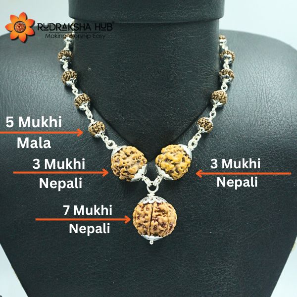 मोतियों की संख्या : 2 मोती 3 मुखी रुद्राक्ष , 1 मनका 7 मुखी रुद्राक्ष , और 108 मोती 5 मुखी रुद्राक्ष