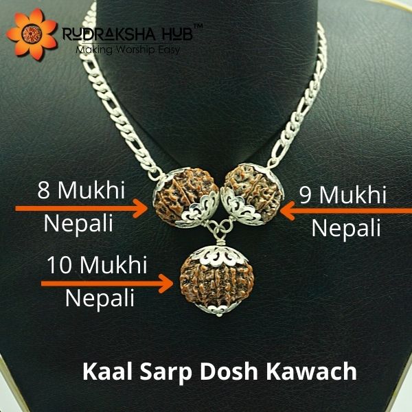 Kaal Sarp Dosh Rudraksha Kawach is a combination of 8 Mukhi Rudraksha, 9 Mukhi Rudraksha, and 10 Mukhi Rudraksha in silver capping with pure silver chain. This combination is making the most difficult and mythologically defiant problem of the Indian ecosystem correct from an astrological standpoint.