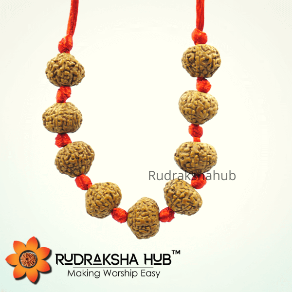 These are 9 beads of 9 mukhi Indonesian rudraksha beads closely knit properly in a red silk thread knotted once at the end of each bead to avoid friction amongst the beads, customized at the orders of a customer. Customize your requirements by sending us a message at wa.me/918542929702 or info@rudrakshahub.com and we shall be happy to help. Till then, keep reading, keep learning, keep smiling, and happy shopping..!!