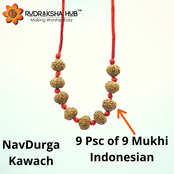 9 Mukhi Rudraksha symbolizes the Nine forms of Goddess Durga namely: Shailputri, Brahmacharini, Chandraghanta, Kooshmanda, Skandamata, Katyayani, Kalratri, Mahagauri, and Siddhidatri. Each of these 9 forms has a story of their own to pronounce. They represent one form of Nav Durga in each bead of Nav Durga Kawach. Know more about 9 Mukhi Rudraksha here.
