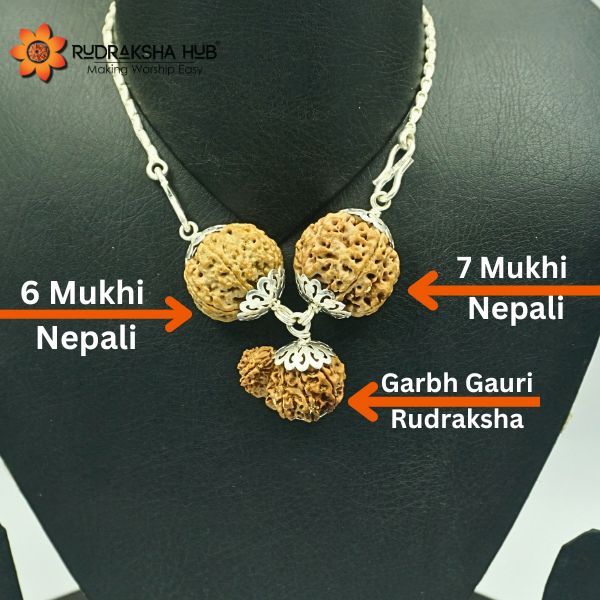 Number of Beads: 1 bead each of 6 Mukhi Rudraksha, 7 Mukhi Rudraksha, and Garbha Gauri Rudraksha