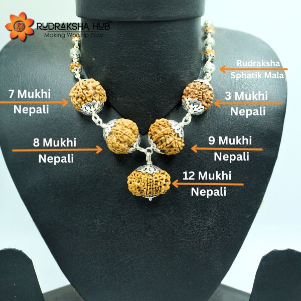 Number of Beads: 1 bead each of 3 Mukhi Rudraksha, 7 mukhi Rudraksha, 8 Mukhi Rudraksha, 9 Mukhi Rudraksha, and 12 Mukhi Rudraksha, 27 Beads of 5 Mukhi Rudraksha in Rudraksha Sphatik Mala, and 27 Beads of Sphatik in Rudraksha Sphatik Mala