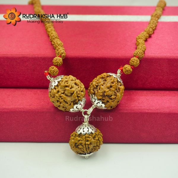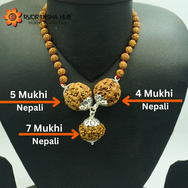 Number of Beads: 1 bead each of 4 Mukhi Rudraksha, 5 Mukhi Rudraksha, and 7 Mukhi Rudraksha and 108 beads of 5 Mukhi Rudraksha Mala