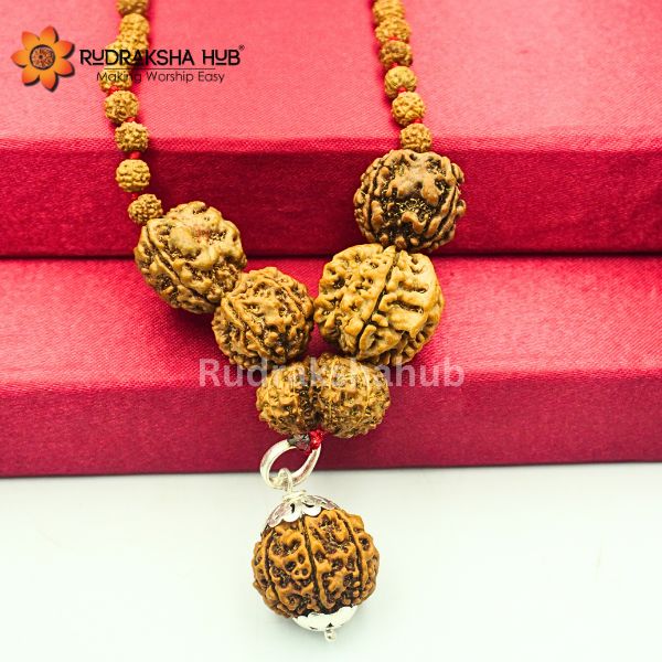 Combination: 3 Mukhi Rudraksha, 4 Mukhi Rudraksha, 6 Mukhi Rudraksha, 7 Mukhi Rudraksha Pure Silver Capped, Ganesha Rudraksha and Gauri Shankar Rudraksha in a 5 Mukhi Rudraksha mala