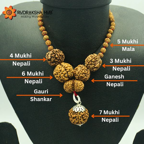 Number of Beads: 1 bead each of 3 Mukhi Rudraksha, 4 Mukhi Rudraksha, 6 Mukhi Rudraksha, 7 Mukhi Rudraksha, Ganesha Rudraksha and Gauri Shankar Rudraksha and 108 beads of 5 Mukhi Rudraksha
