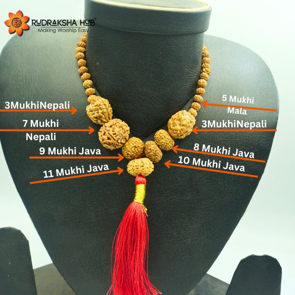 Combination: 2 Mukhi Rudraksha, 3 Muhi Rudraksha, 7 Mukhi Rudraksha, 8 Mukhi Rudraksha, 9 Mukhi Rudraksha, 10 Mukhi Rudraksha and 11 Mukhi Rudraksha in a mala of 5 Mukhi Rudraksha Mala