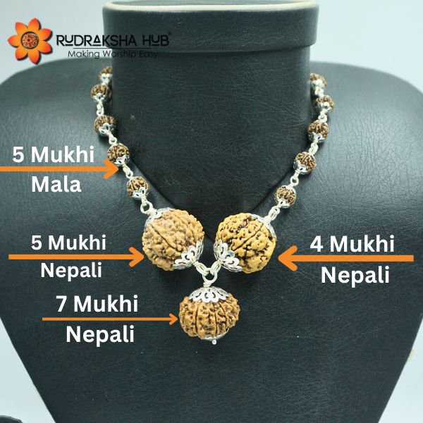 Quantity of Silver Used: 3 grams each in 4 Mukhi Rudraksha, 5 Mukhi Rudraksha, and 7 Mukhi Rudraksha, and 22 grams in the 5 Mukhi Rudraksha mala